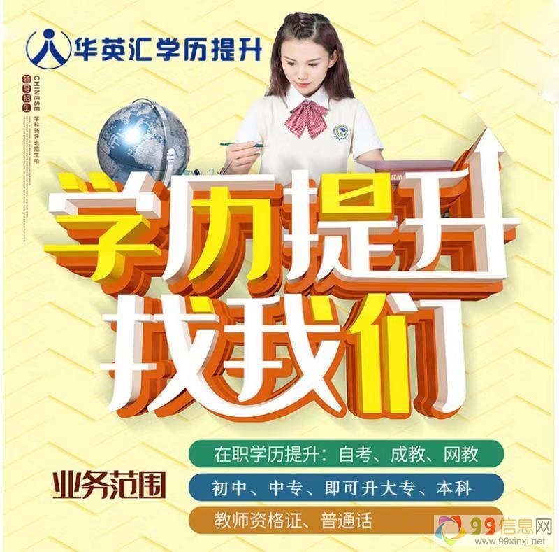 华英汇成人教育中心是专业网络教育服务机构,初中学历可以直接参加华英汇的自考学习,华英汇成人教育中心自考有江苏师范大学、南京理工大学自考大专学历提升,江苏师范大学有学前教育、早期教育等自考专业,南京理工大学有计算机、艺术设计等自考专业,我们为广大用户提供优质、可靠的高等 教育服务www.99xinxi.net。了解更多详情请登wwwmAe。hyhhrmAe。cn或致电壹捌玖陆壹叁陆陆柒零柒详询9_9_信_息_网。学校地址:连云港市苍梧路龙河大厦A座11层,品牌:华英汇9~9~x~i~n~x~i~n~e~t。